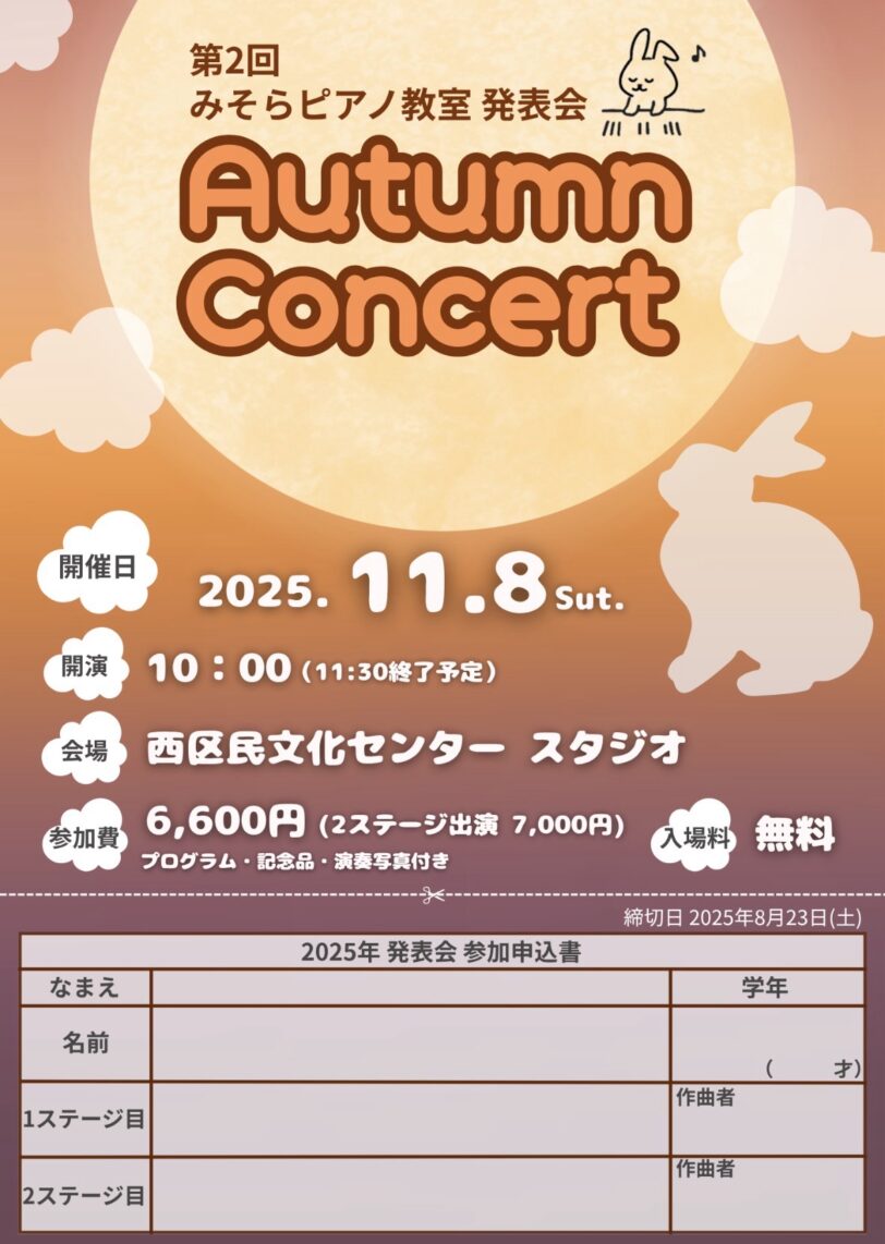 久しぶりのブログ更新となってしまいました(;o;) 最近は来月行われる発表会の準備で忙しくしております。 というわけで今年もやります! ★2025年11月8日(土)★ 西区民文化センター スタジオで開催です! 発表会の申し込み用紙やポスターは 秋のお月見をイ… -